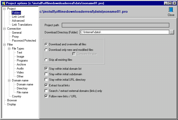 You can re-download websites by pressing the "download" button or by continuing the download from the last site you have visited. To do this select the proper file on the "download tree" and press "Resume".